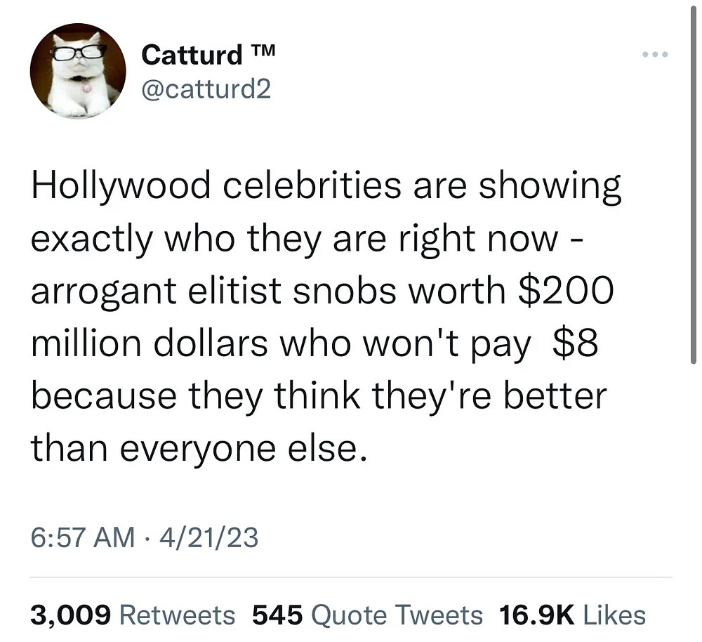 And that is what the problem here seems to be -- it eats at them that people don't need to know that THE catturd tweeted out the latest inane conspiracy theory about trans people making your milk go sour. (If this works its way into conspiracy theory land, my deepest apologies to trans people. And milk.) They seem convinced that somehow not recognizing them as notable marks them as lesser. I blame Ayn Rand.