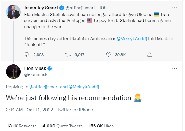 In other, surely unrelated news, it came out yesterday that Elon is being investigated by the SEC over his antics around his on-again off-again purchase of Twitter. I am certain the famously thin-skinned Elon would not be pulling his support for a critical piece of wartime infrastructure as a way to get the SEC to back off its investigation?